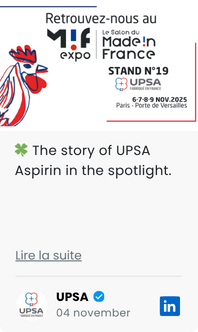 Founded in 1935, UPSA is a French pharmaceutical laboratory committed to supporting both patients and pharmacists. With its range of over-the-counter medicines, medical devices, and dietary supplements, UPSA helps patients relieve everyday minor ailments.
