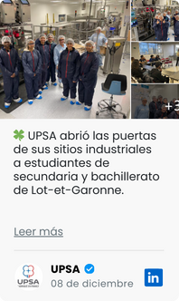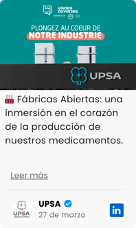 Para UPSA, elegir el “Fabricado en Francia” significa demostrar que otro camino es posible, el de una economía sostenible y virtuosa para las generaciones futuras. Desde hace 90 años, UPSA fabrica sus medicamentos en Agen, en el departamento de Lot-et-Garonne. Y es precisamente este arraigo territorial lo que constituye nuestra singularidad: año tras año elegimos invertir en nuestra herramienta industrial, en nuestras capacidades de I+D y en la excelencia de nuestros colaboradores.