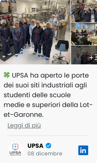 Per UPSA, scegliere il Made in France significa dimostrare che un modello diverso è possibile: quello di un’economia sostenibile e virtuosa, pensata per le generazioni future. Da oltre 90 anni, l’azienda produce i propri medicinali ad Agen, nel dipartimento del Lot-et-Garonne. Questo radicamento territoriale rappresenta la nostra unicità e si traduce in investimenti costanti nel sistema industriale, nelle attività di Ricerca & Sviluppo e nel valore dei nostri collaboratori.