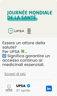 Fondata nel 1935, UPSA è un laboratorio farmaceutico francese da sempre vicino ai pazienti, medici e ai farmacisti. Attraverso una gamma completa di specialità medicinali, prodotti per l’automedicazione, e integratori alimentari,